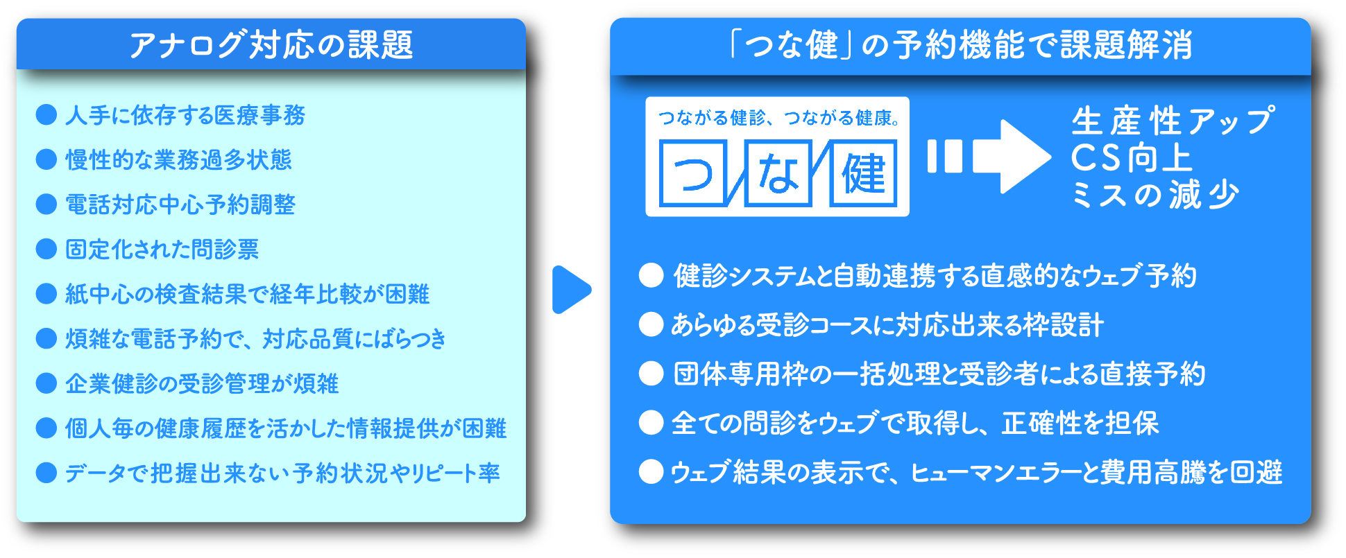 こうした中、ウェルコンパスが着目したのが、健診業務全体をカバーする「DXによる業務改革」だ。同社は、健診ウェブDXソリューション「つな健」を開発。同サービスは、健診・人間ドック業務を予約、問診、結果管理迄を一気通貫でウェブ化し、分断されていた業務を統合。全てのプロセスをオンラインで完結する事で、マンパワーへの依存を大幅に減少させる。